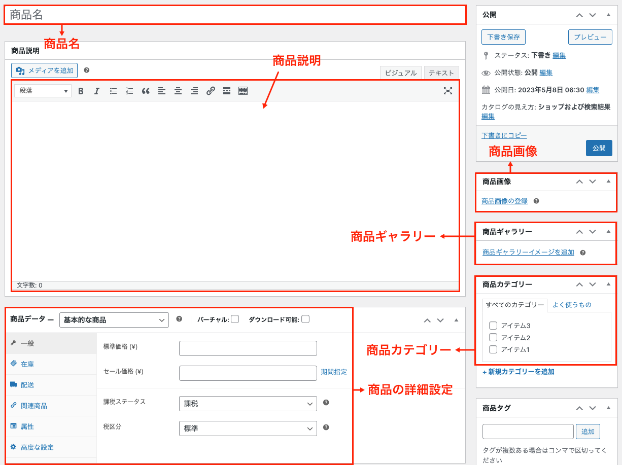 運営管理画面から【商品】>【新商品を追加】をクリックすると新規追加ページが開きます。