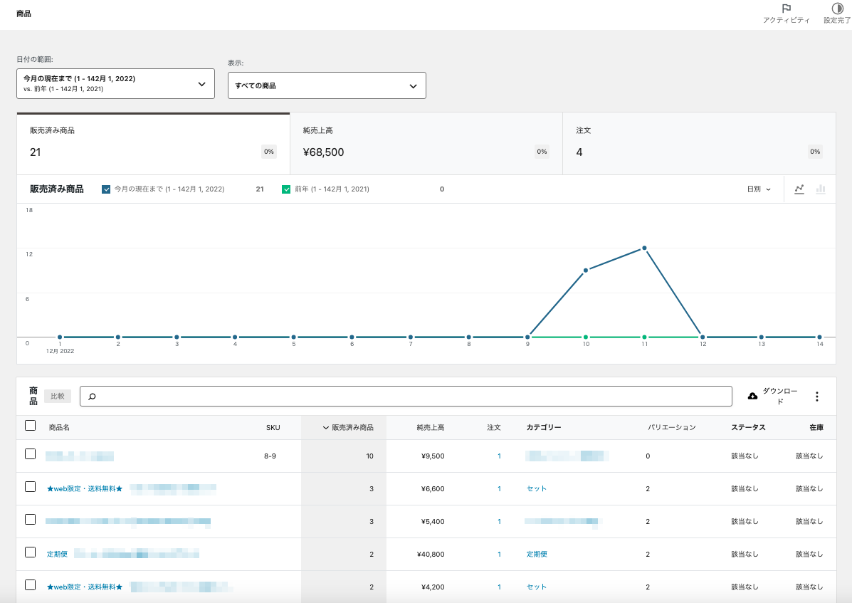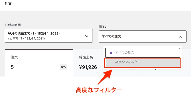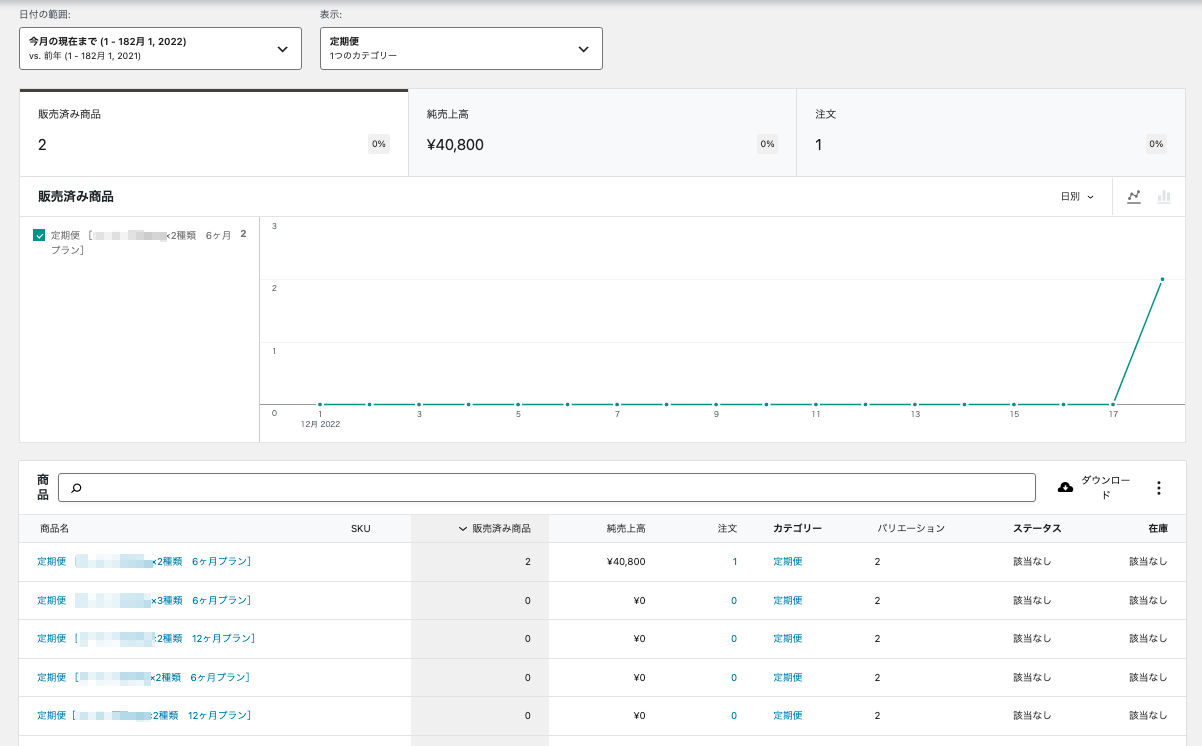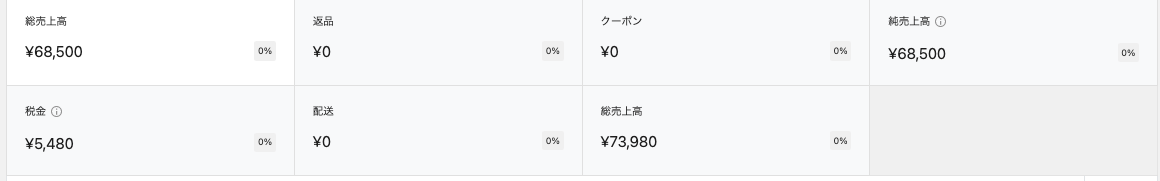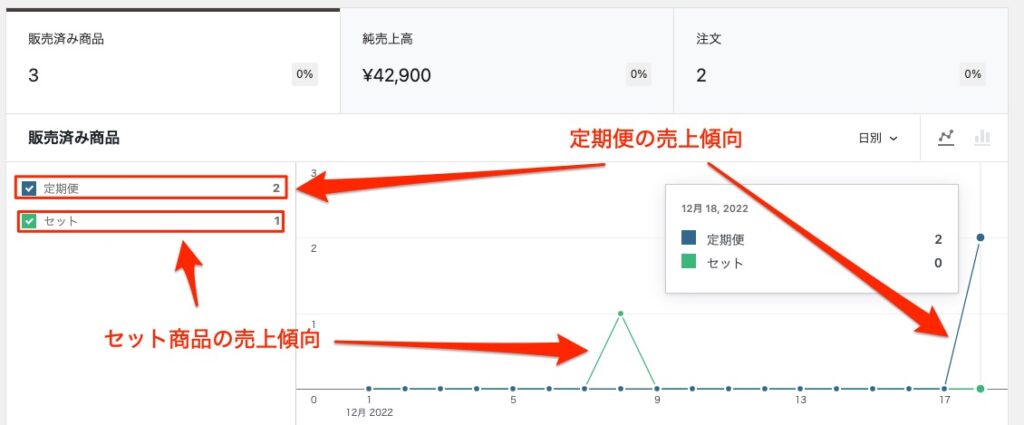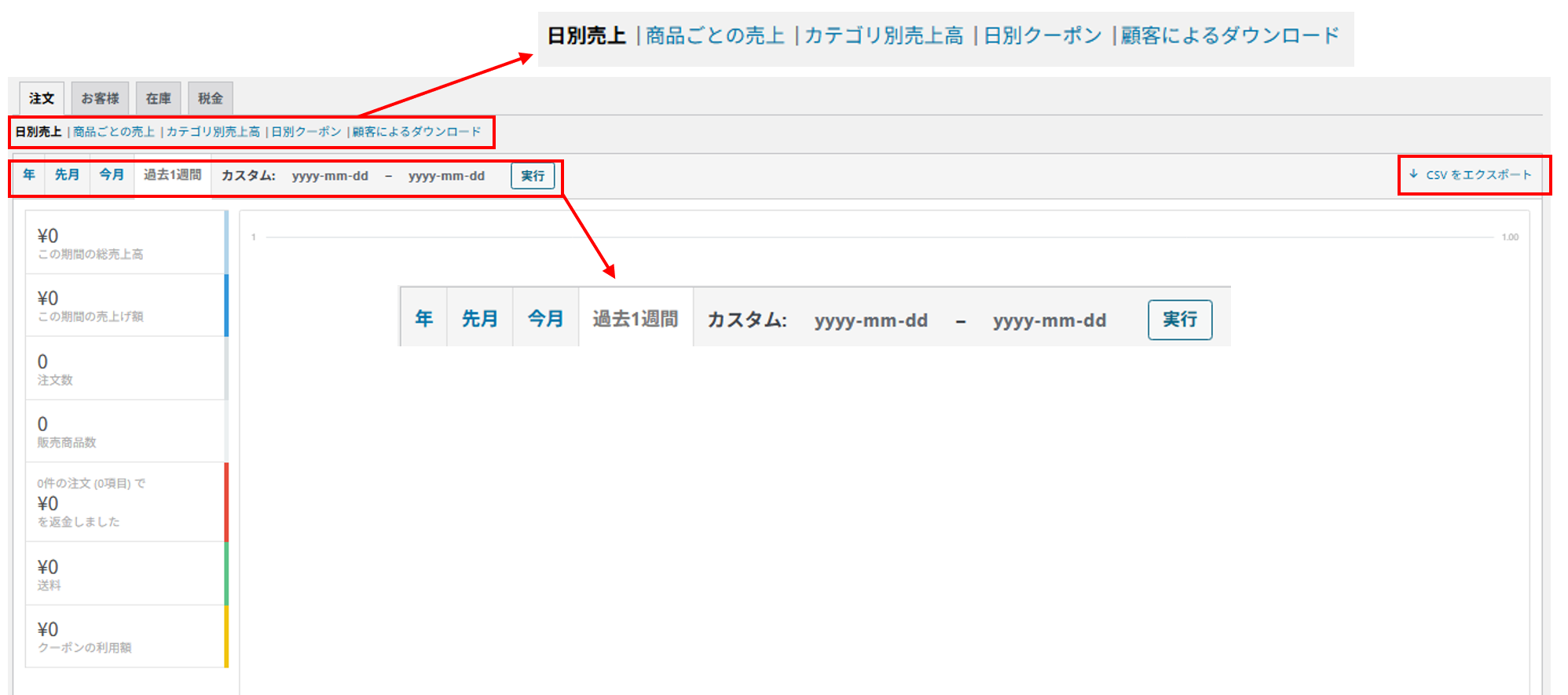 指定した期間における売上高、注文数、平均注文額といった基本的な販売実績に加え、売上の推移をグラフで視覚的に把握できます。
